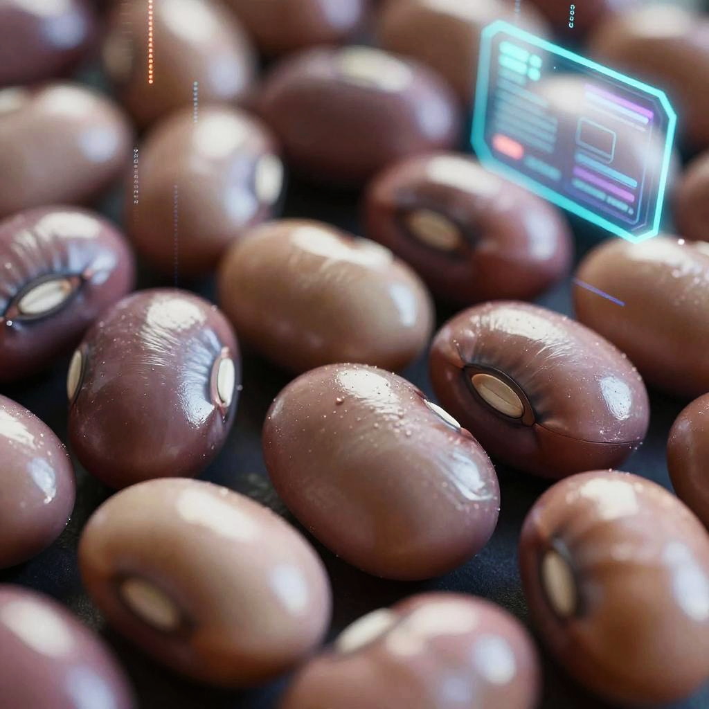 Futuristic azuki beans NFT featuring hyper-realistic close-ups of shiny, detailed azuki beans with reflective, metallic surfaces, set against a dark background filled with abstract digital data streams and glowing holographic interfaces.