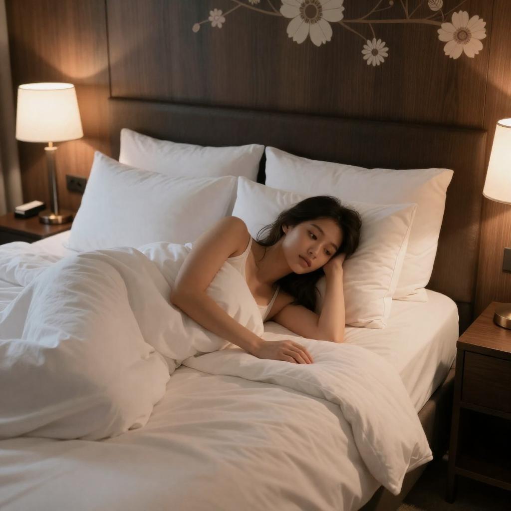 Photograph of a young woman with fair skin and long brown hair, wearing a white lace tank top, lying on a red pillow in a dimly lit room. She holds a black remote control in her right hand and points to it with her left index finger, looking intently at the remote. A gold bracelet adorns her left wrist.