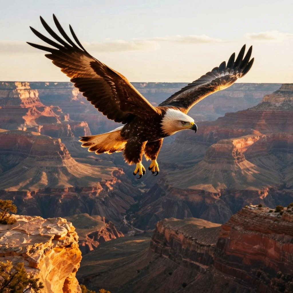 Highly detailed illustration of a majestic eagle soaring high, in a vast canyon with rugged cliffs, with warm golden hour light highlighting rock textures, soft textures, serene mood, intricate feather details, HD quality, gentle shadows, creating an inviting atmosphere for relaxation