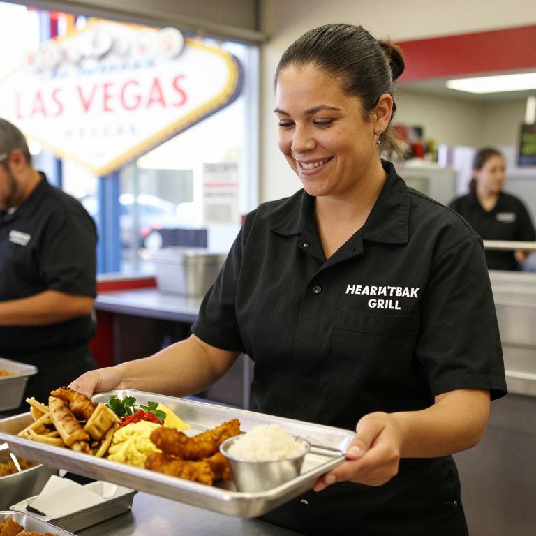 Jaimee Lee, dressed in a black uniform, smiles warmly while serving food from a stainless steel tray at the Heart Attack Grill in downtown Las Vegas on Monday, Mar. 5, 2012.