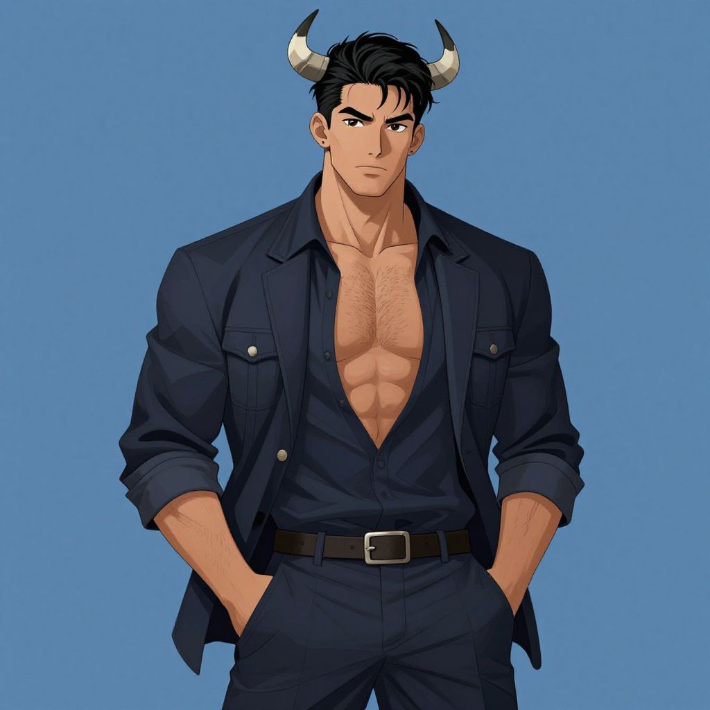 Digital illustration of a confident, muscular young man with black hair and bull horns. The character wears a dark open shirt revealing a hairy chest, paired with a dark jacket and pants, standing against a plain blue background with hands in pockets.
