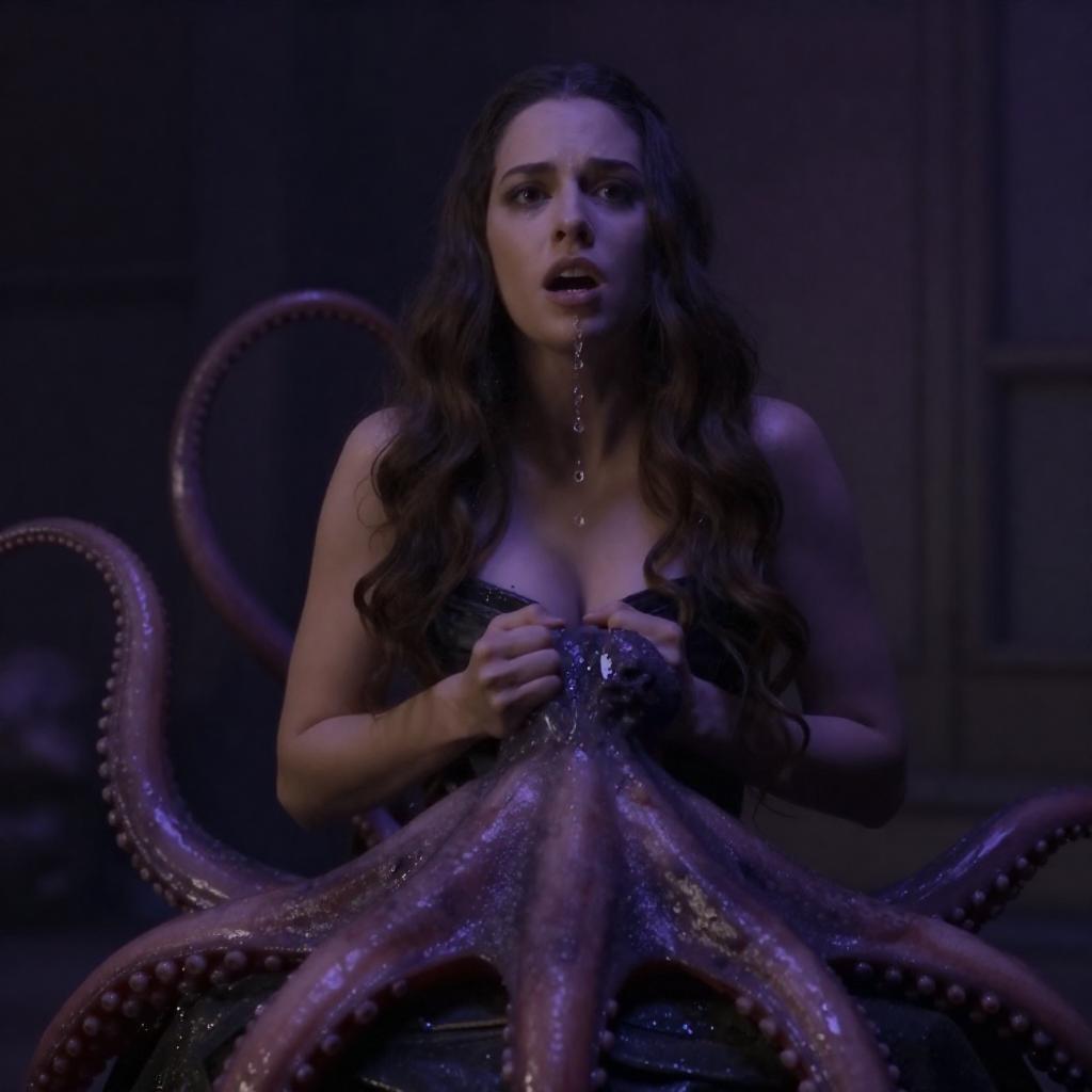 A dark, purple-hued photograph shows a woman with long, wavy hair and a strapless top, her body entangled with a large, tentacled creature. The creature's tentacles wrap around her, one tentacle splashing liquid onto her face. The background is dimly lit with wooden structures. The woman's expression is one of surprise or fear.
