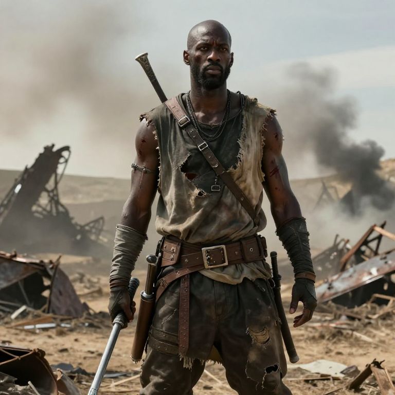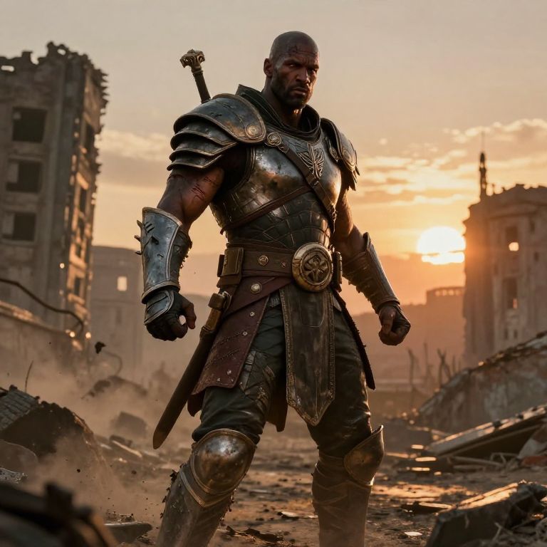 Portrait of a big muscular black man in heroic fantasy armor, holding a massive sword, detailed textures, dramatic lighting, epic background with stormy skies and ancient ruins