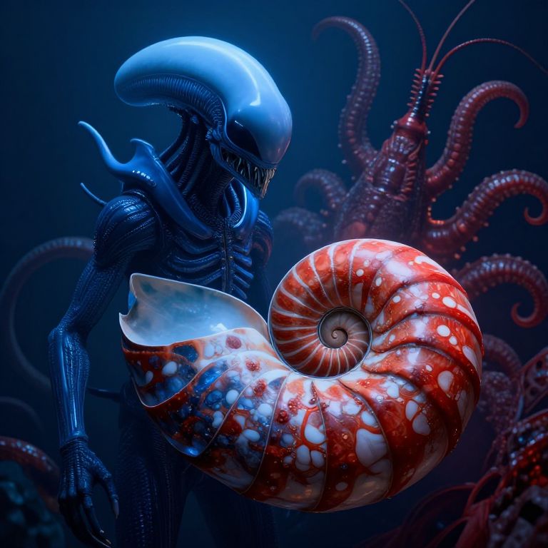 Double Exposure the Nautilus lobster of the future blue and red as the Alien by Giger, background giger lobster nautilus style, Nostromo, unbelievable and artistic, hyper realistic, super detailed,