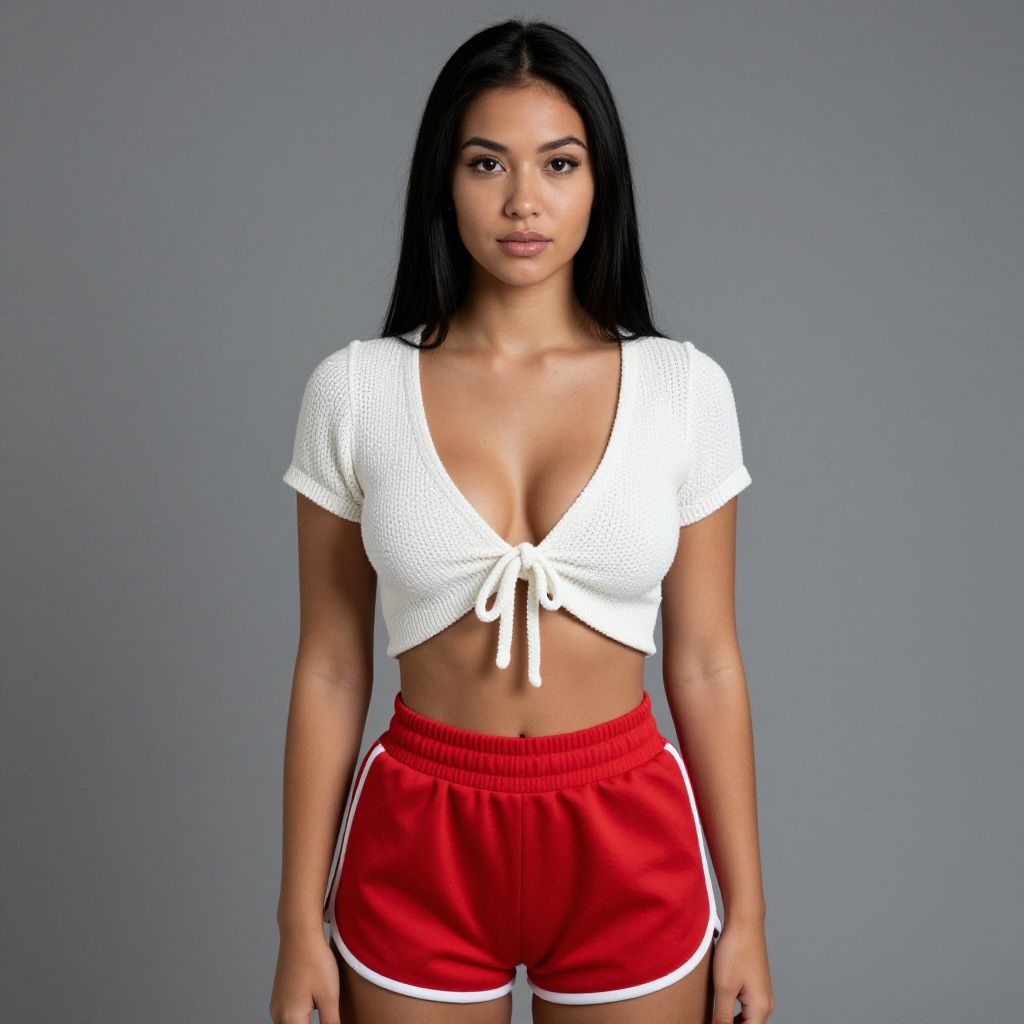 Photograph of a young woman with long black hair and medium skin tone standing against a plain gray background. She's wearing a white, knitted, short-sleeve crop top with a deep V-neck and tie front, highlighting her cleavage. She pairs it with bright red, high-waisted, loose-fitting athletic shorts with white trim. Her expression is neutral, and she's facing the camera directly.