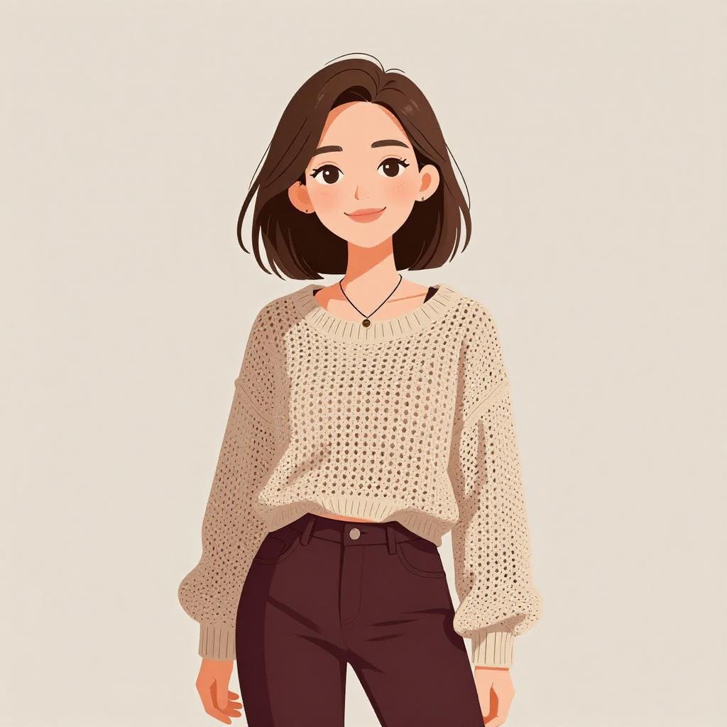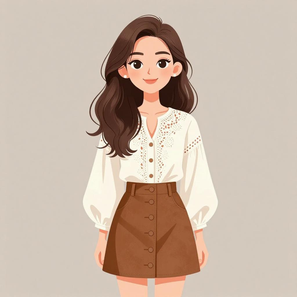 Woman with pretty face and pretty hair. smiling Woman, casual bohemian, loose-fitting pullover in cream with mixed-fabric design, button-up collar, horizontal textured stripes in earthy tones, drop shoulder with long sleeves, drawstring-adjusted waist, paired with a cream, high-waisted skirt featuring a crocheted lace hem, plain background in a light-filled room. --sref 1467