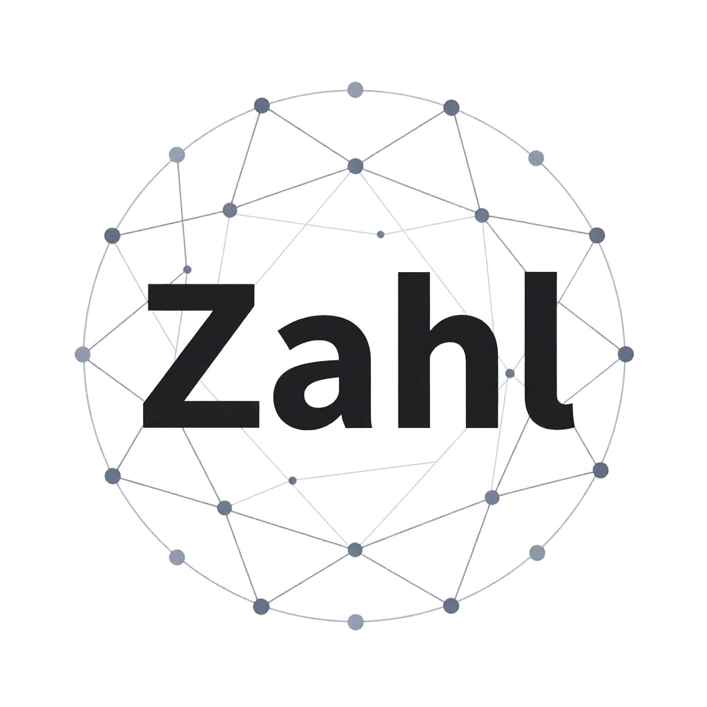 Minimalist design featuring the word 'Zahl' in bold typography, surrounded by a network of interconnected lines and dots symbolizing data and connectivity, monochrome with a hint of blue, sleek and modern tech aesthetic