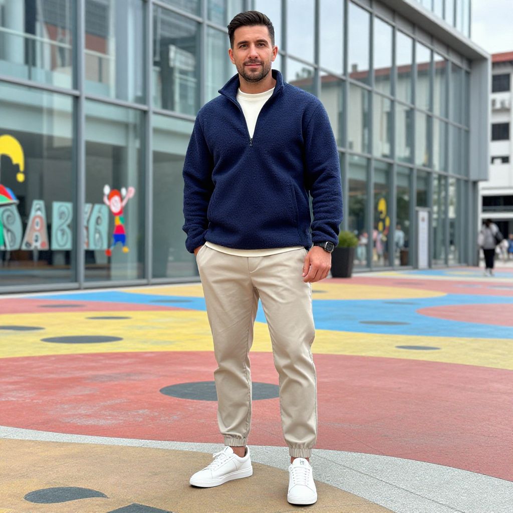 A man, navy blue fleece zip-up, beige tapered joggers, cream crew neck sweatshirt, sleek white trainers, casual street aesthetic, modern glass structure, vibrant urban plaza, colorful street art, hand-tinted photograph, relaxed smile. Man has masculine face and piercing eyes