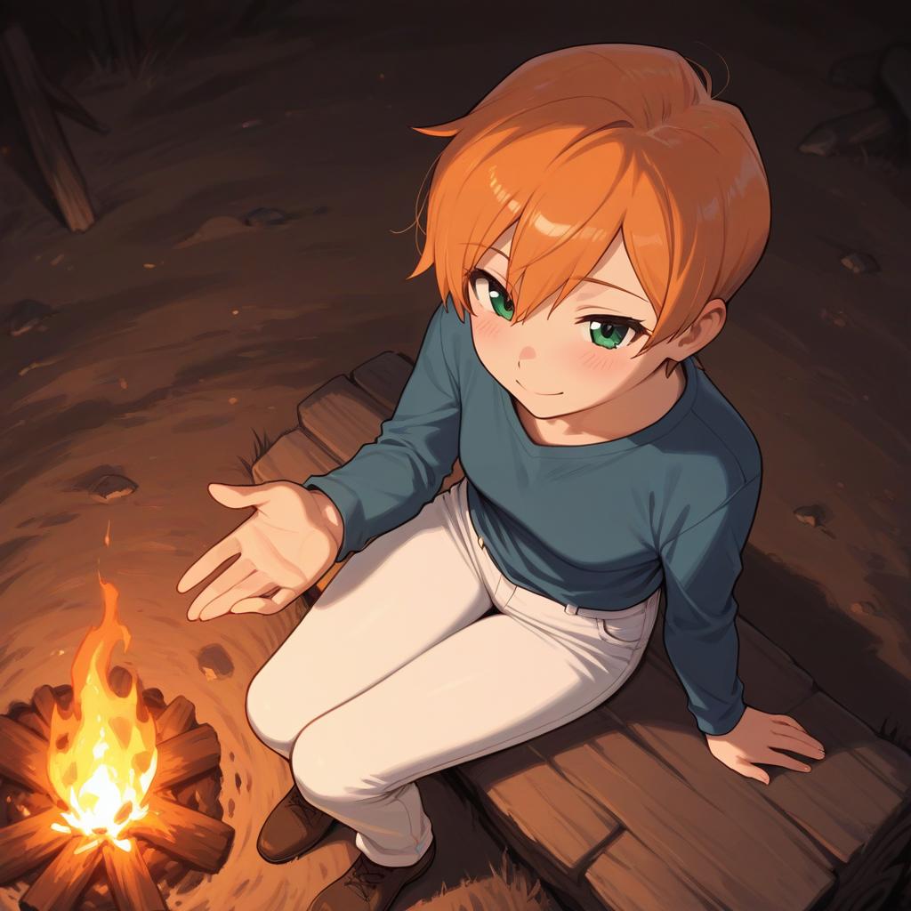 Digital artwork of an anime-style girl with short orange hair and green eyes, sitting on wooden planks near a campfire at night. She is wearing a long-sleeve blue shirt, white pants, and brown shoes. The scene is lit warmly by the campfire, showing her gentle smile and outstretched hand gesture from an above perspective.