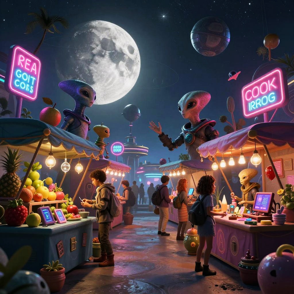 Mcdaniels, an imaginative futuristic marketplace on another planet, alien species interacting in vibrant stalls, exotic fruits and high-tech gadgets, colorful neon signs, dramatic sky with multiple moons and stars
