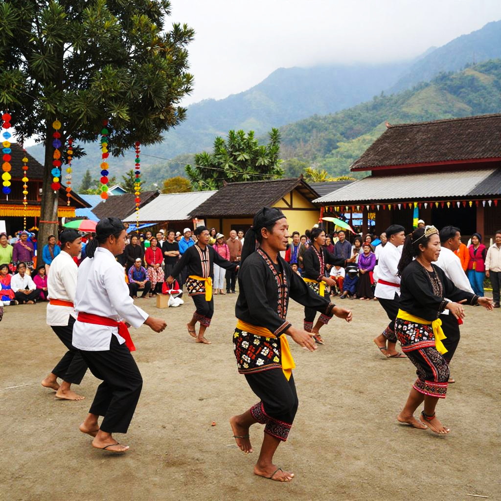 Desa village festival celebration, villagers dressed in traditional costumes performing a cultural dance in open square, colorful decorations hanging from trees, mountains in background, lively energy, detailed facial expressions, dynamic motion, vibrant natural colors