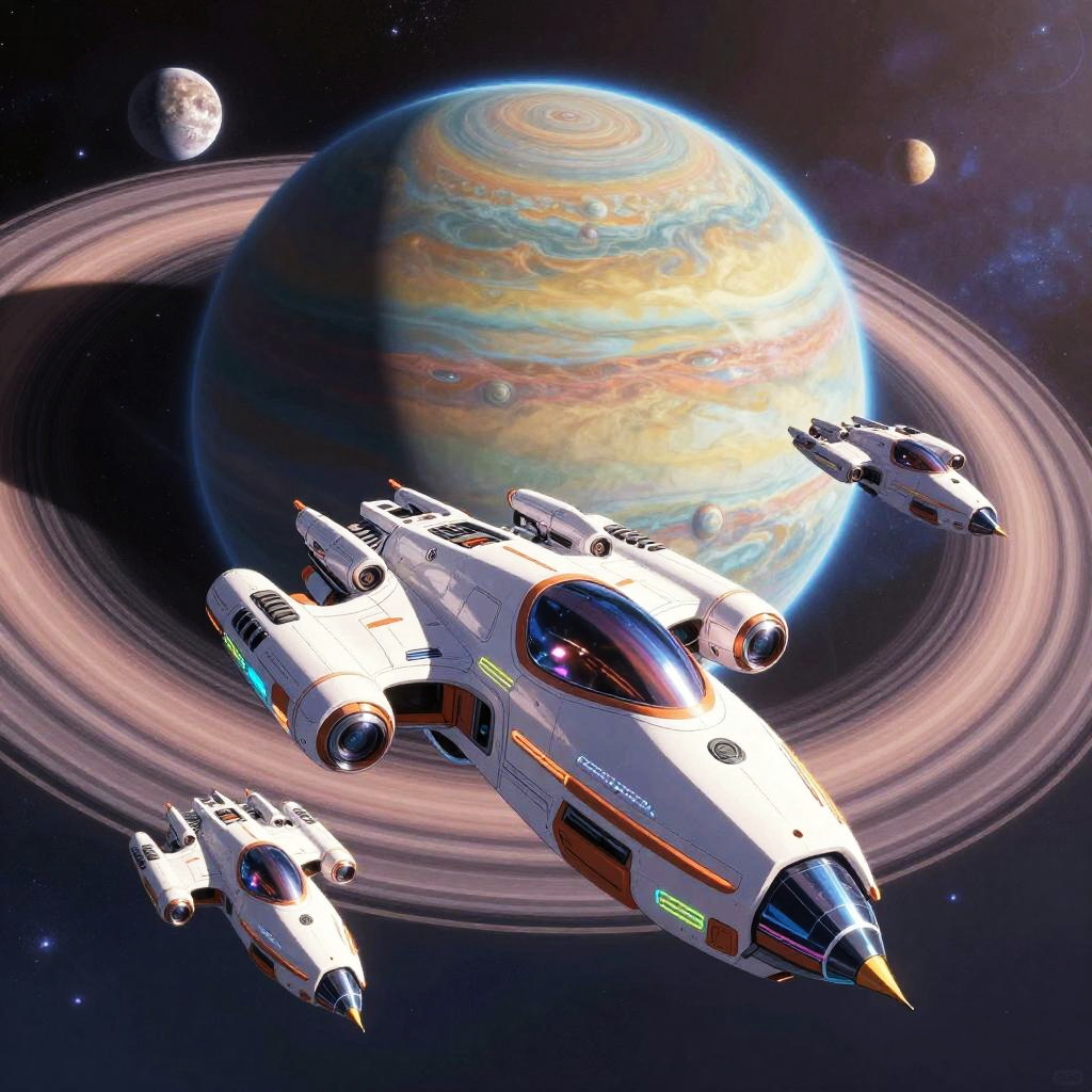 Anime starships cruising through the rings of a giant gas planet, glossy surfaces with holographic markings, stylized futuristic design, vivid cosmic skies with swirling clouds and moons, bright saturated colors, detailed background, imaginative sci-fi scene
