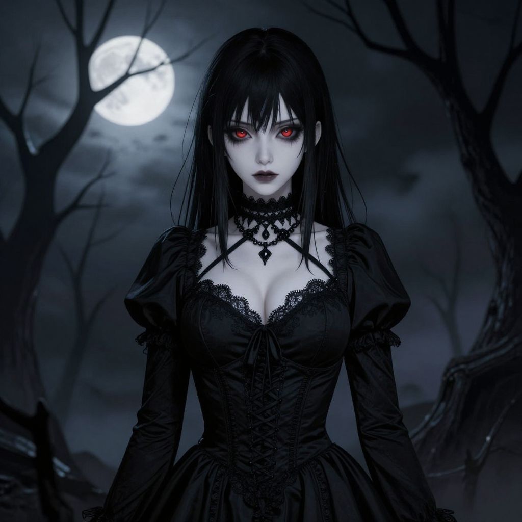 Digital illustration of a pale-skinned, gothic woman with striking red eyes and long, straight black hair. She wears a black, Victorian-style lace dress with puffed sleeves and a low-cut neckline, accentuated by a black choker with a diamond pendant. The background is a dark, moonlit forest with bare, twisted trees and a full moon partially obscured by clouds. The overall atmosphere is eerie and mysterious, with a strong contrast between the woman's pale skin and the dark, moody background. The art style is detailed and somewhat realistic, emphasizing a gothic, supernatural theme.