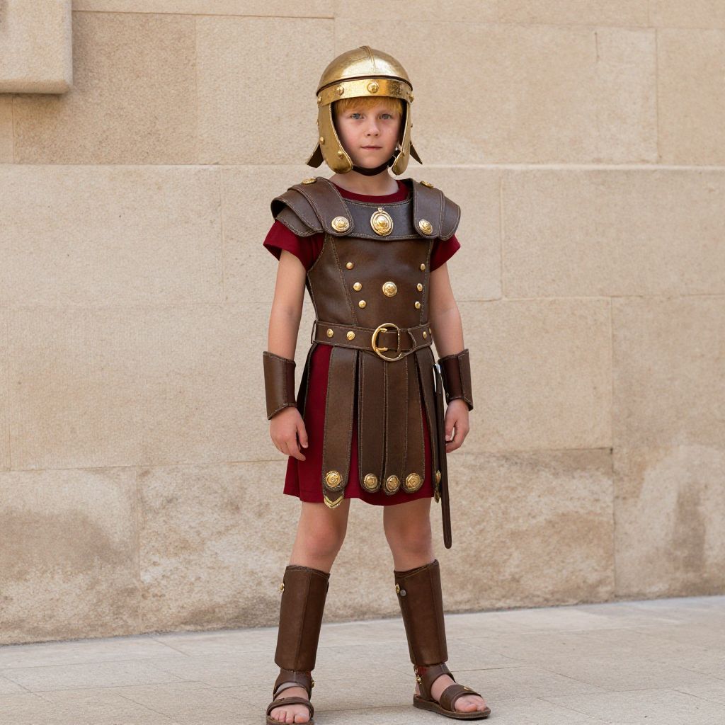 Photograph of a young child dressed as a Roman soldier, wearing a golden helmet, brown leather armor, and sandals, standing against a beige stone wall