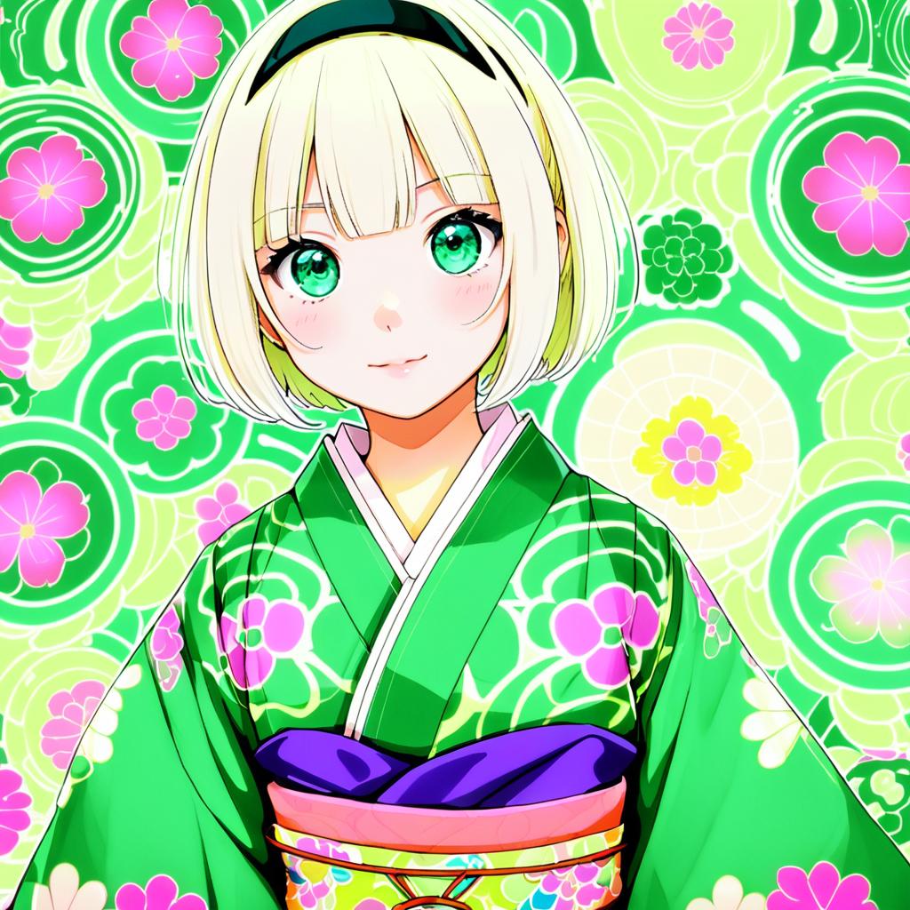 Moriyama shiemi, ao no exorcist, 1girl, green eyes, blonde hair, short hair, ahoge, hairband, kimono, by artist cuteg, anime