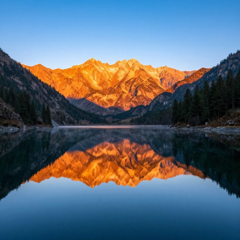 Photograph of a stunning mountain landscape at sunset. Majestic, orange-lit peaks reflect perfectly in a calm, glass-like lake. The mountains occupy the upper half of the image, bathed in warm, golden light, contrasting with the deep blue sky. Dark, forested slopes frame the lake on both sides. The clear water mirrors the vibrant mountain hues, creating a symmetrical reflection. Pine trees are sparse on the right, adding texture to the scene. The overall composition is balanced and serene, capturing the natural beauty and tranquility of the setting.