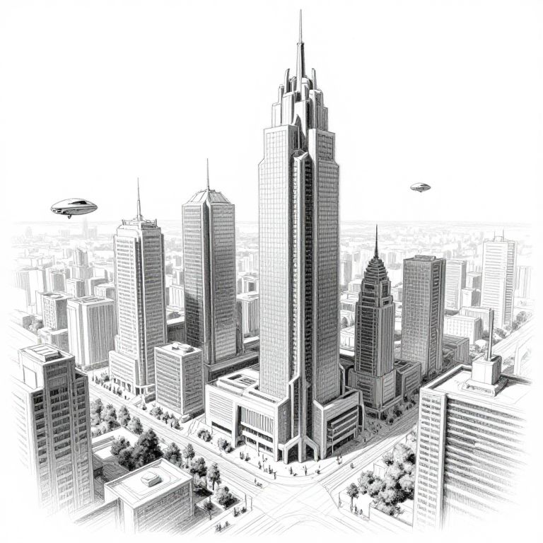 Reference sketch of a futuristic cityscape, intricate linework highlighting towering skyscrapers, flying vehicles, and bustling streets, monochrome pencil style with fine shading and perspective detail, capturing the essence of urban architectural planning.