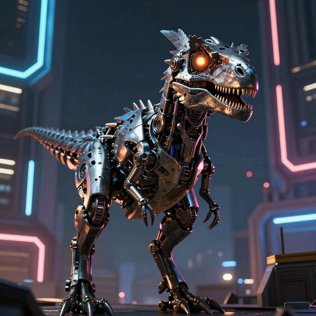 Raptor front view, sci-fi biomechanical raptor with glowing eyes and metallic feathers, cybernetic enhancements on limbs, futuristic dark cityscape with neon lights in background, sharp contrast lighting, high detail and vibrant reflections