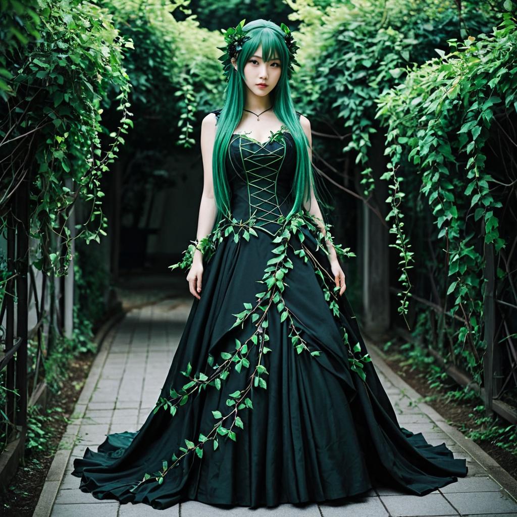 Cosplay costume idea, Ibara Shiozaki Vine, sexy black layered evening dress with vine-like elegance, long flowing green hair