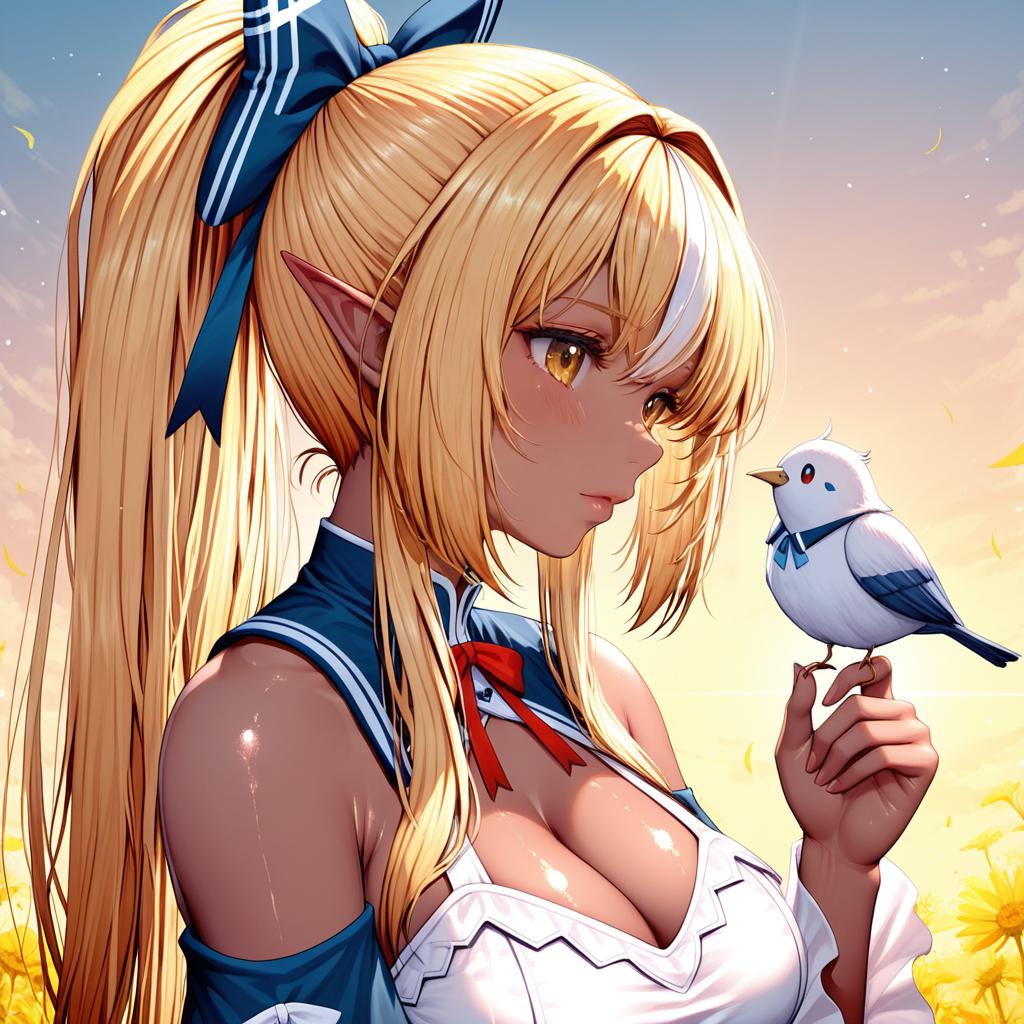 Digital illustration of a dark-skinned female elf with stereotypical pointed elf ears, long blonde and white streaked hair tied in a high ponytail with a blue bow. She wears a white dress with a blue and red ribbon and detached blue sleeves. The elf is gently holding a small white bird with blue wings and a blue bow on its neck. The scene is set against a soft sunset background with yellow flowers, highlighting her large eyes and delicate features.