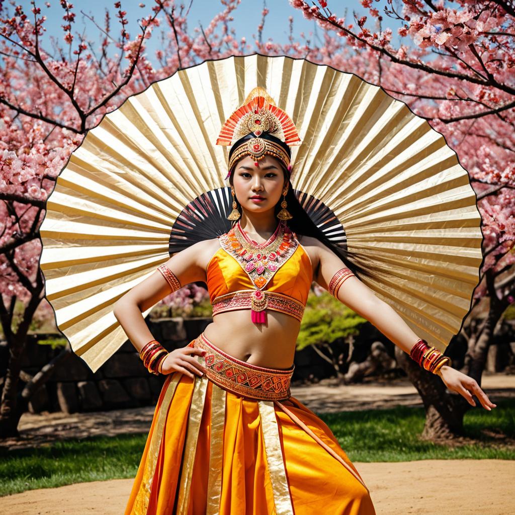 Fan dance costume, photo of a female dancer in gold and orange traditional costume, tribal headpiece, standing in a defensive pose, background with pink cherry blossom trees, daylight, CGI, vibrant colors, detailed jewelry, intricate costume design, digital art, fantasy style