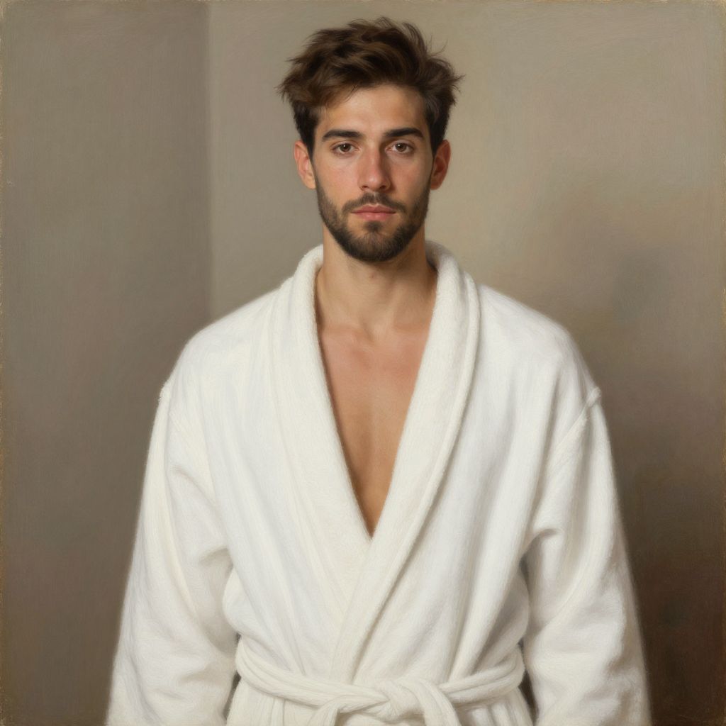 Photograph of a young, Caucasian man with short, dark brown, slightly tousled hair and a trimmed beard. He has a serious expression and brown eyes. He is wearing a white, V-neck, terrycloth bathrobe, which is tied at the waist. The background is a plain, light gray wall, slightly out of focus. The lighting is soft, highlighting his facial features and the texture of the robe. The overall style is realistic with a slight digital enhancement, giving it a slightly polished but natural look.