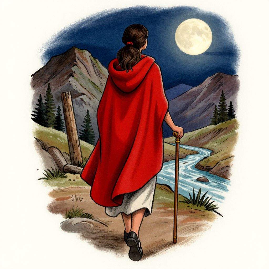 Illustration: Woman in red cloak and white dress, holding a cane, walks away from a full moonlit mountain river scene.