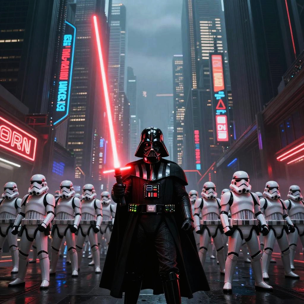 Trump Darth Vader leading an army of stormtroopers across a dystopian cityscape, towering skyscrapers with neon signs, red lightsaber glowing vividly, dramatic, futuristic style