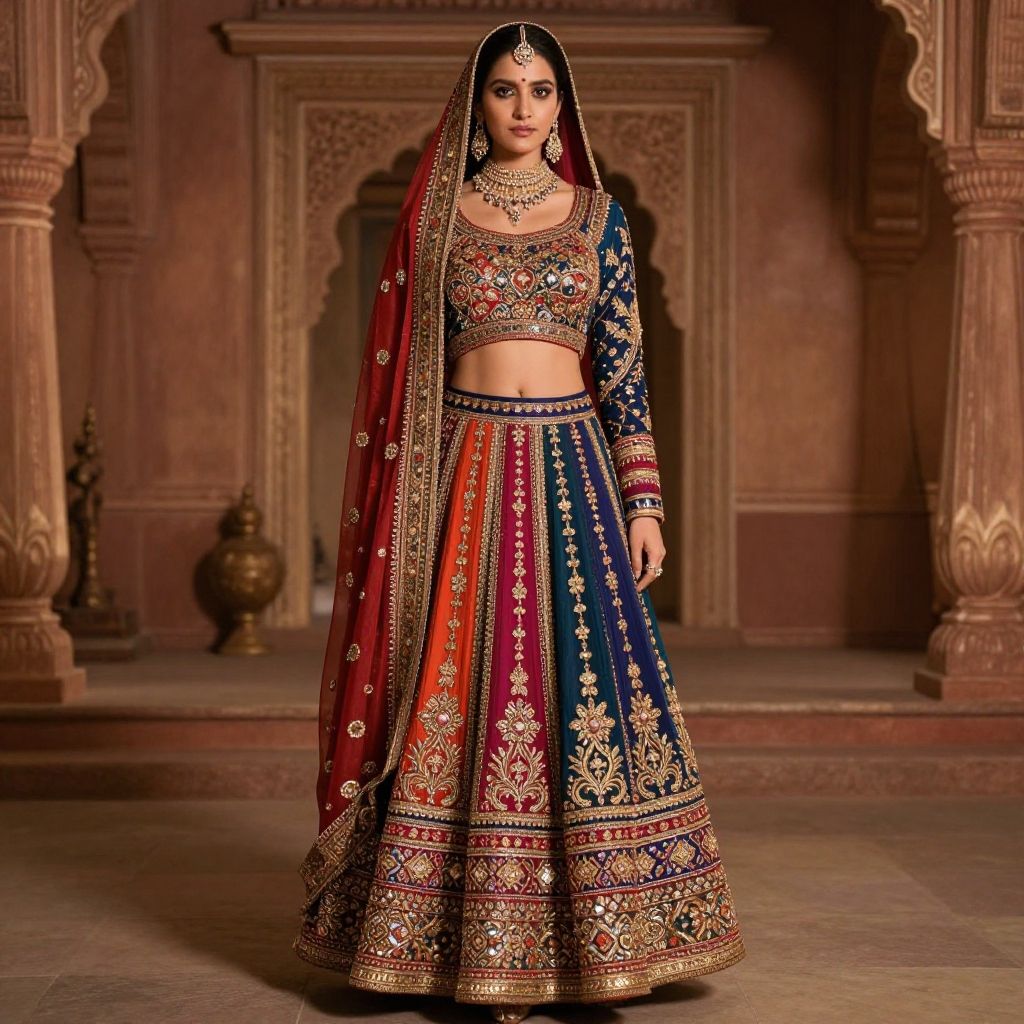 Bhool Bhulaiyaa costume inspired by traditional Indian attire with intricate embroidery, vibrant colors, and detailed patterns, set against an ancient palace backdrop, emphasizing mystique and cultural richness in a cinematic style.