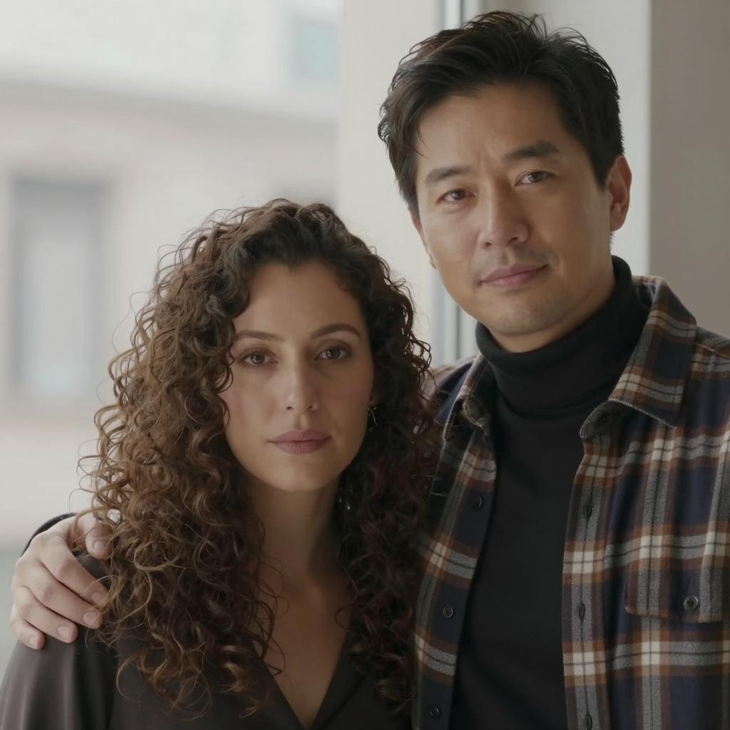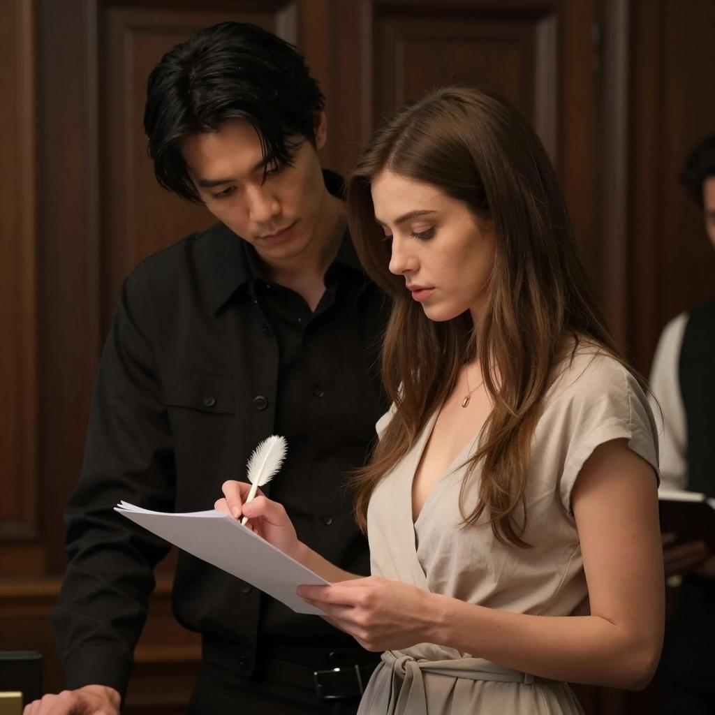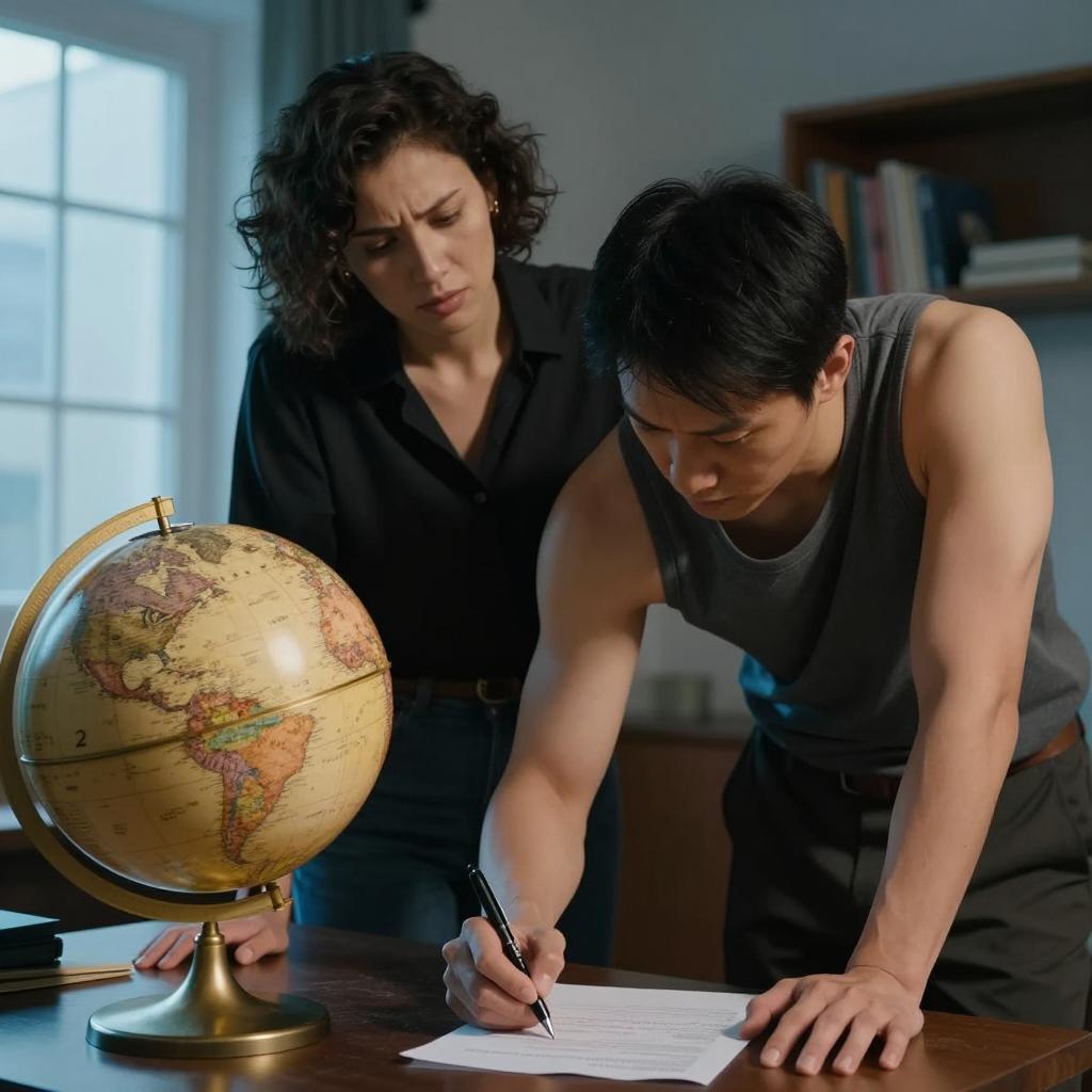 Photograph of a man and a woman in a dimly lit room. The man, with short black hair, a muscular build, and a dark tank top, leans over a table, writing with a pen. The woman, with short curly hair, a black top, and a concerned expression, stands behind him, pointing to the paper. A gold globe and documents are on the table. Blue lighting casts a cool tone over the scene. The background has a window and shelves. Both are focused on the paper.