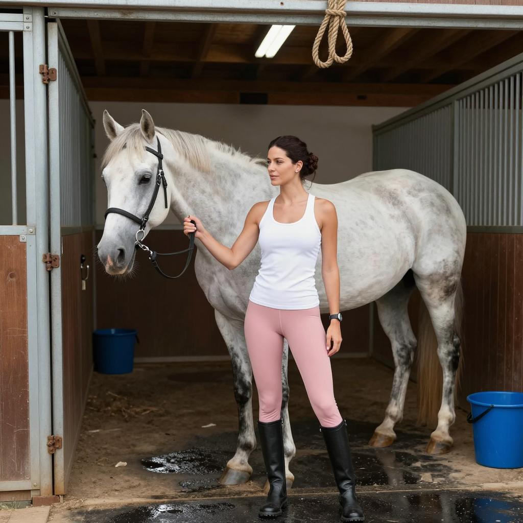 Woman with dark hair in bun, wearing white tank top, pink leggings, black boots, holding horse's halter, standing in stable, gray horse on black wet floor, blue water bucket on right, wooden ceiling, holding rope overhead.