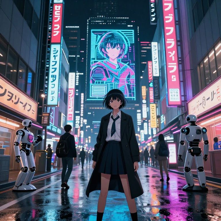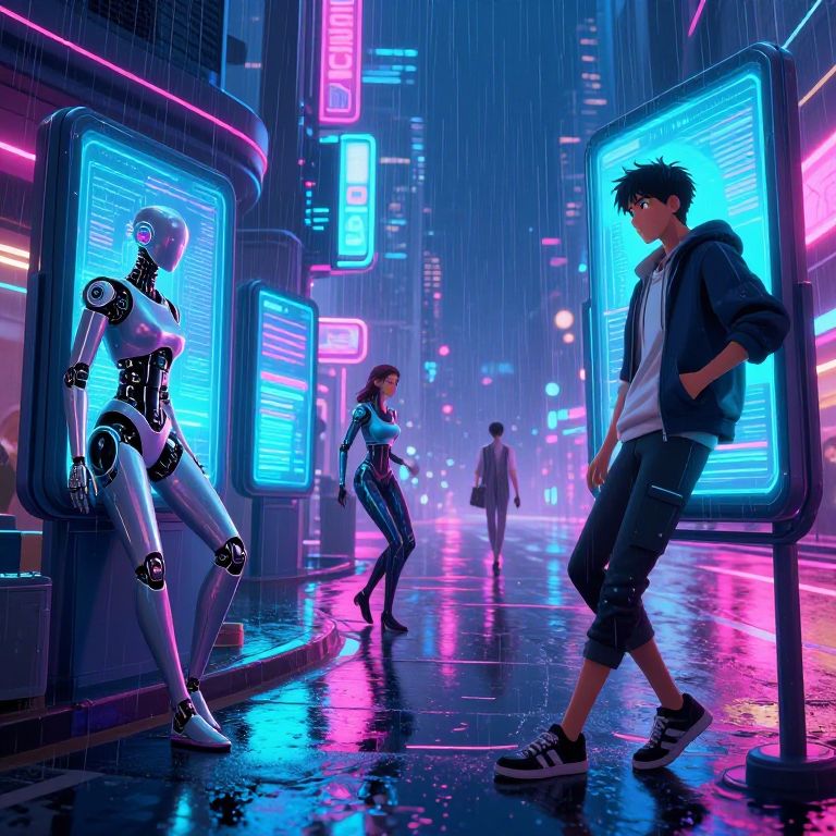 Leans theme in an animated cyberpunk world, sleek androids and humans leaning on holographic displays and neon-lit street corners, rain-soaked streets, vibrant reflections, dynamic composition emphasizing motion and urban nightlife energy.