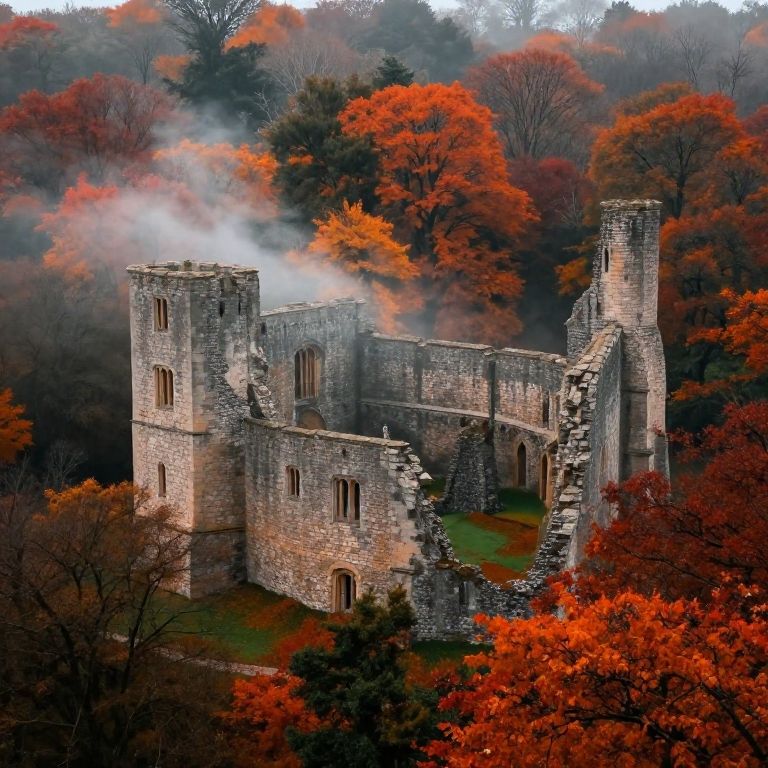 Bosworth castle ruins surrounded by dense forest during autumn, leaves in fiery shades of orange and red, eerie mist rolling over crumbled stone walls, mysterious and atmospheric setting evoking a sense of ancient history.