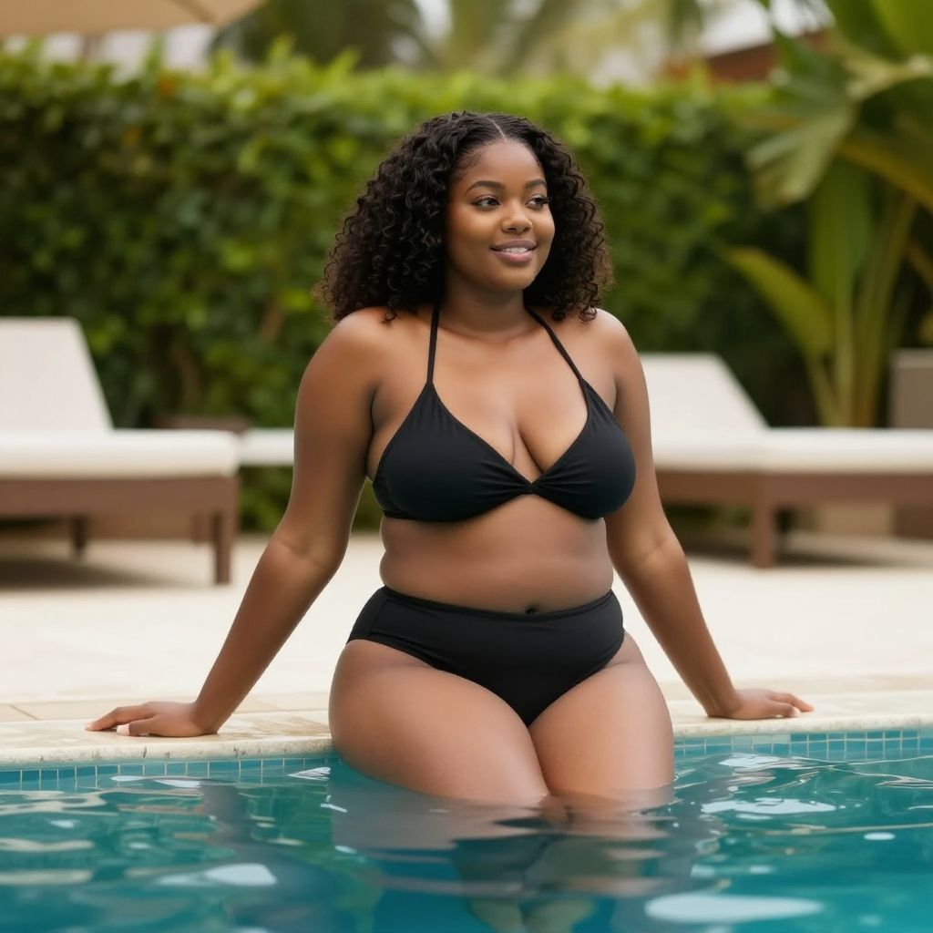 Photograph of a curvy Black woman with medium brown skin and long, curly black hair, sitting in a pool. She is wearing a black bikini with a halter top and high-waisted bottoms, showcasing her full breasts and thick thighs. She has hoop earrings and a slight smile. The background features blurred greenery and white sun loungers. The pool water is clear blue, and her hands rest on the pool's edge. The image has a vibrant, summery feel.