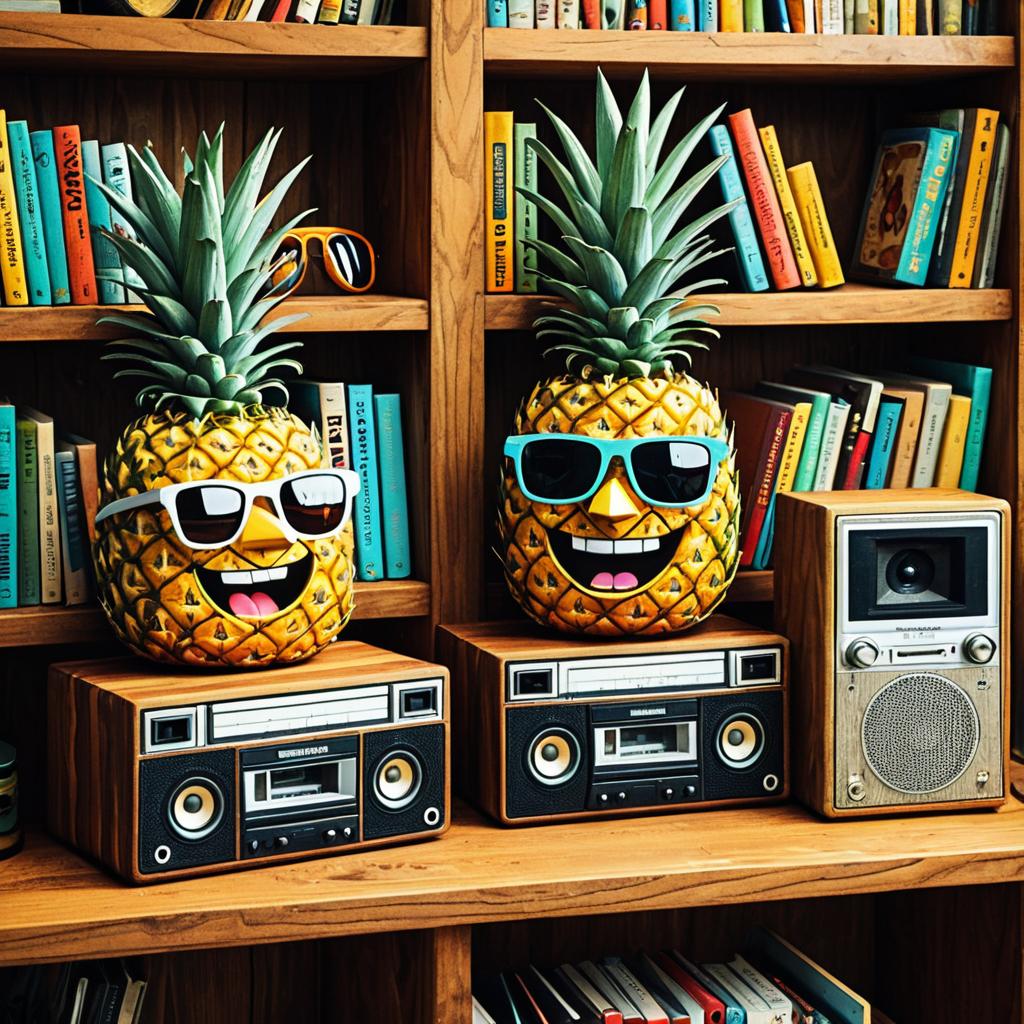 Cheerful Pineapples with Sunglasses and Retro Cassette Players on Bookshelf