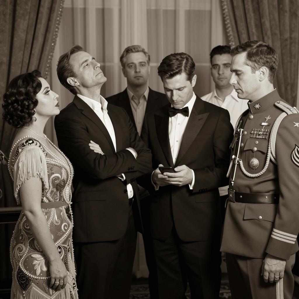 Sepia-toned photograph of six people in formal attire. Woman on left in ornate dress with fringe, short dark hair, neck arched back. Man next to her in black suit, head tilted back, arms crossed. Man to his right in dark suit, looking down at phone. Man on far right in military-style uniform with medals. Two men in background, one in dark suit, one in white shirt. Draped curtains in background. Intense expressions.