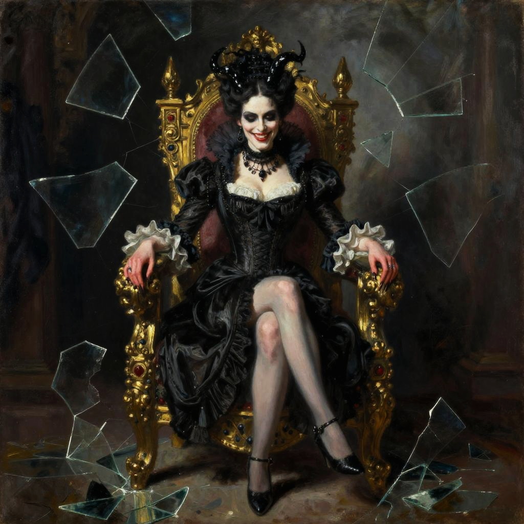 Cruel wife sitting on a throne, surrounded by shattered glass, elegant yet menacing, with a smirk, vintage Victorian attire, dramatic shadows, oil painting style