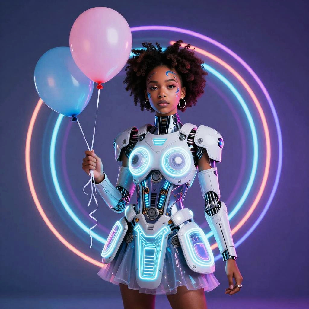 Photograph of a young Black woman with dark skin and natural curly hair, styled in two high puffs. She wears a futuristic, glowing white and blue cyberpunk-style armor dress with neon accents and a high collar. She holds three balloons – one blue, one white, and one orange – in her right hand. The background features vibrant, circular neon light trails in pink and blue against a dark blue gradient. Her expression is calm and confident. The image has a high-contrast, futuristic aesthetic with a focus on cyber and neon elements.