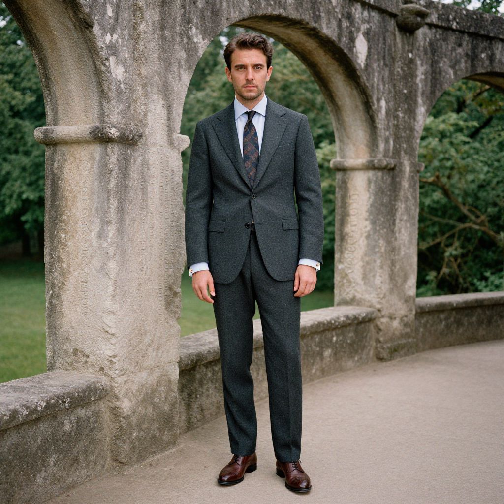 A man, charcoal gray wool suit, light blue cotton dress shirt, patterned silk tie, brown leather brogues, elegant cufflinks, ancient stone arches, weathered inscriptions, lush green surroundings, anscochrome analog film, confident expression. Man has masculine face and piercing eyes