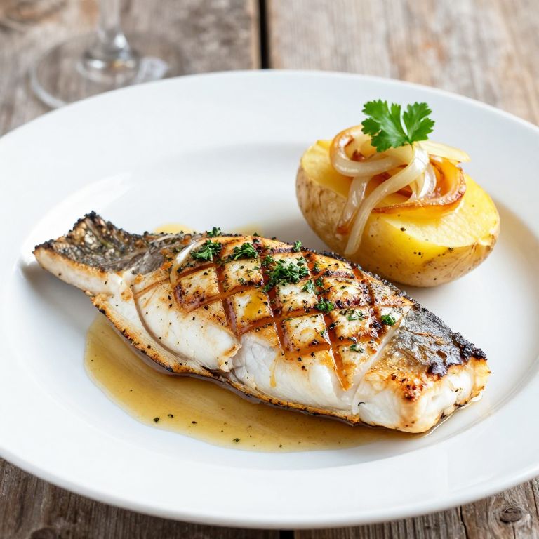 Grilled dorado fillet, marked with a perfect diamond sear pattern and garnished with fresh herbs, rests atop a pool of rich sauce, accompanied by a golden-baked potato topped with slices of caramelized onions and a sprig of parsley, all presented on a pristine white plate against a rustic wooden backdrop.