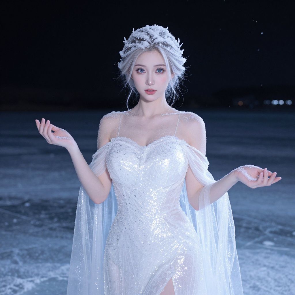 A stunning woman in a winter snow spirit costume, dressed in a white shimmering gown made of frozen snow and light, her face soft with a porcelain complexion and large, serene blue eyes, standing on a frozen lake under a starry night, the snow gently falling around her, her hands lightly outstretched as if guiding the frost.. The woman has big tits and cute face