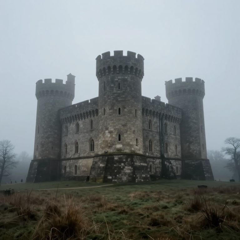 Enveloped in a misty embrace, the castle stands as a silent sentinel of forgotten dreams, its stone towers whispering secrets of timelessness while the earthy scent of damp grass and the chill of morning air evoke a haunting blend of nostalgia and mystery.