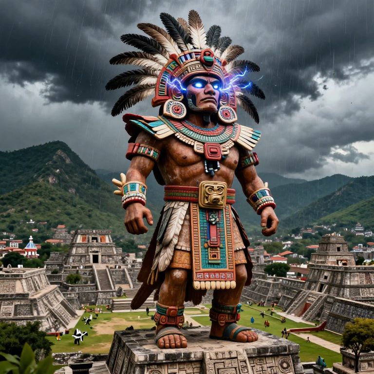 Digital artwork of a giant, muscular Aztec warrior with glowing blue eyes, feathered headdress, and colorful armor, standing amidst ancient pyramids under