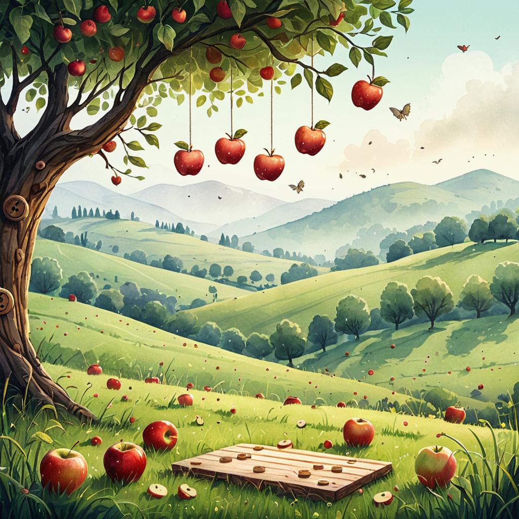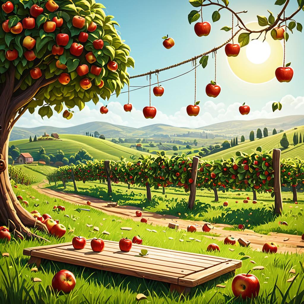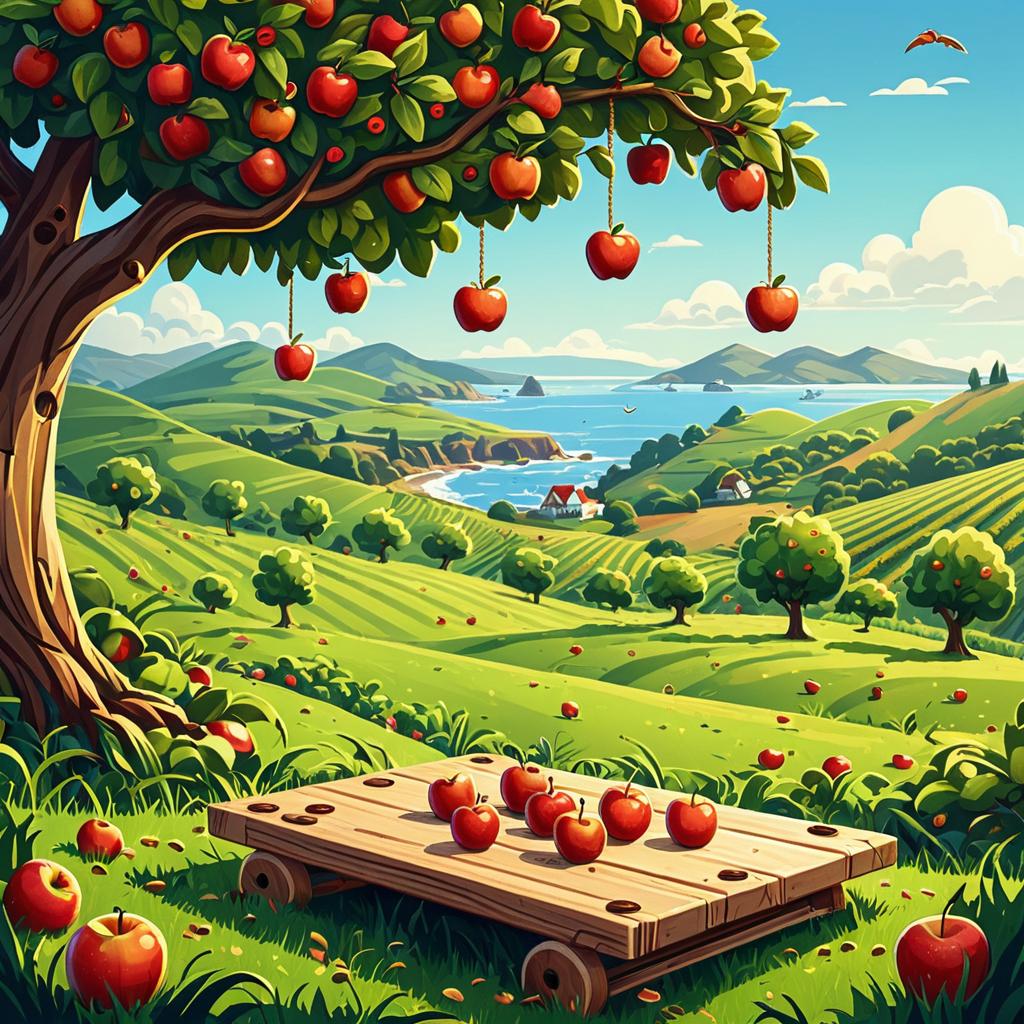 Background artwork for a mobile game called Happy Worm. Set in breezy coastal orchard with gently rolling hills and apple trees scattered. Apples hanging and some falling. vibrant cel-shaded cartoon with wooden board-style buttons.