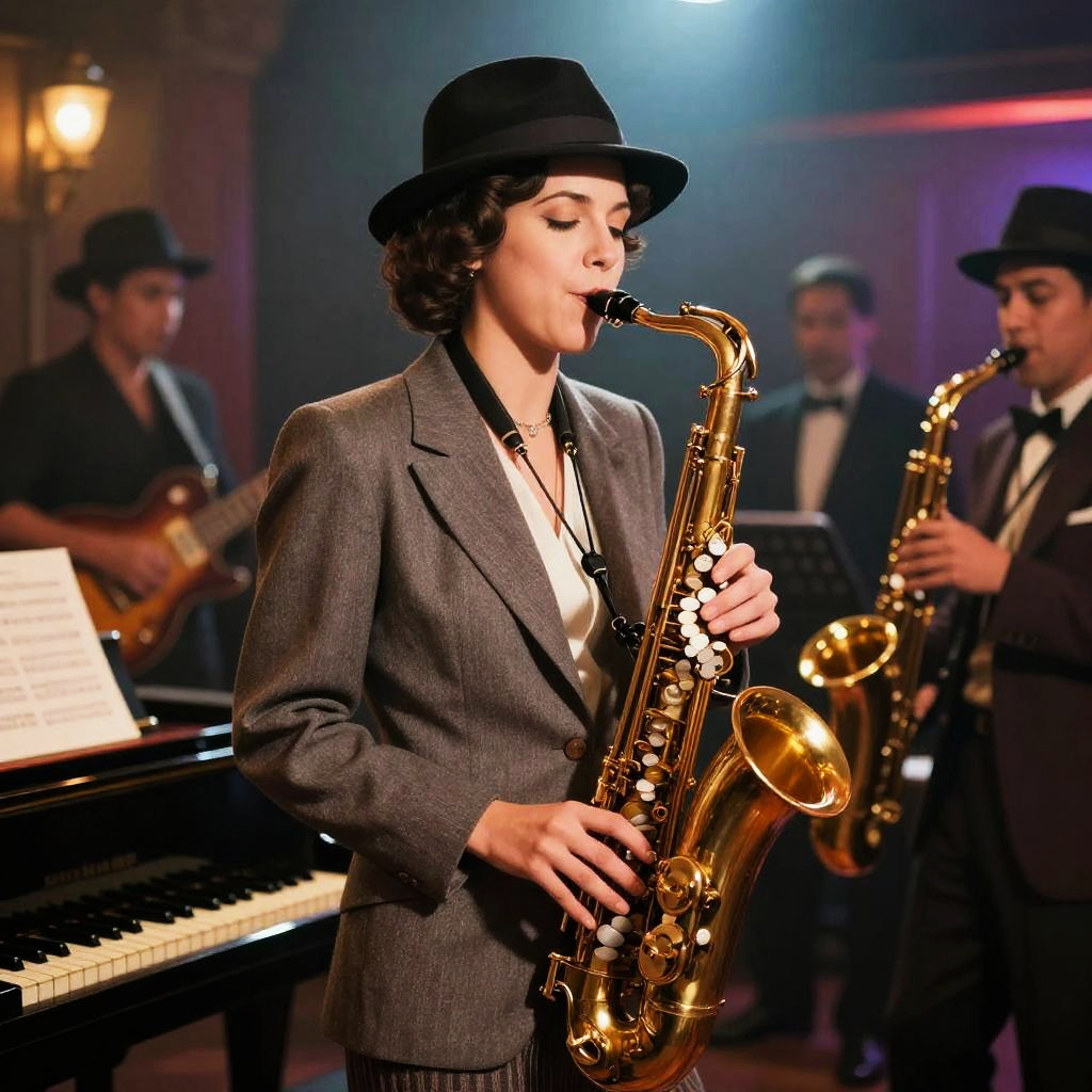 How I would look in the 1930s, illustrated as a jazz club goer with a classy suit or flapper-style dress, iconic cloche hat or fedora, surrounded by musicians playing saxophone and piano, vibrant muted color palette with a hint of smoky ambiance and urban nightlife.