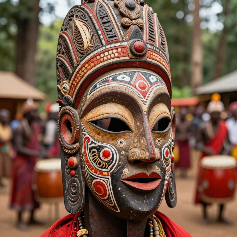 Photograph of a intricately painted wooden mask with a black base, adorned with red, white, and gold patterns. The mask features almond-shaped eyes, a stylized nose, and red lips. It is topped with an elaborate headdress filled with geometric and floral designs. In the blurred background, there are drummers in red clothing, and a forest setting with green trees and thatched roofs. The mask is centered in the foreground, with the background slightly out of focus, emphasizing the mask's detailed artwork and vibrant colors.