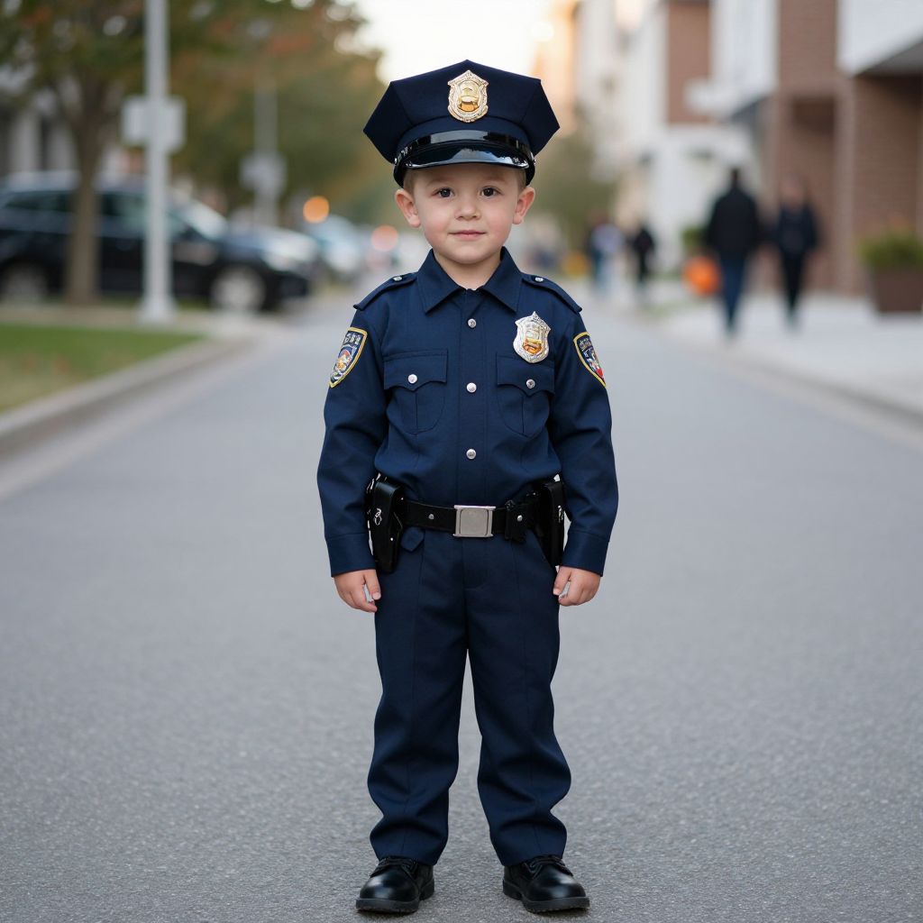 Police Officer Halloween Costume Boy, boy in police uniform standing in a street