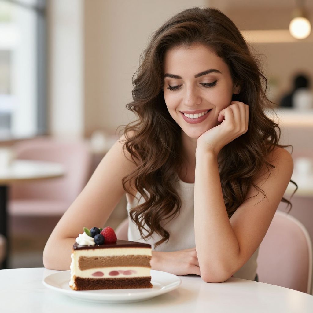 Photograph of a young woman with long, wavy brown hair, wearing a black sleeveless top, sitting at a white table in a bright, modern café. She rests her head on her right hand, smiling softly while looking at a slice of cake with whipped cream and a raspberry on a white plate in front of her. A white coffee cup and saucer are to the right, with a small silver spoon on the left. The background is softly blurred, featuring large windows, a hanging black light, and some kitchen counters. The woman has fair skin and an elegant, relaxed demeanor.