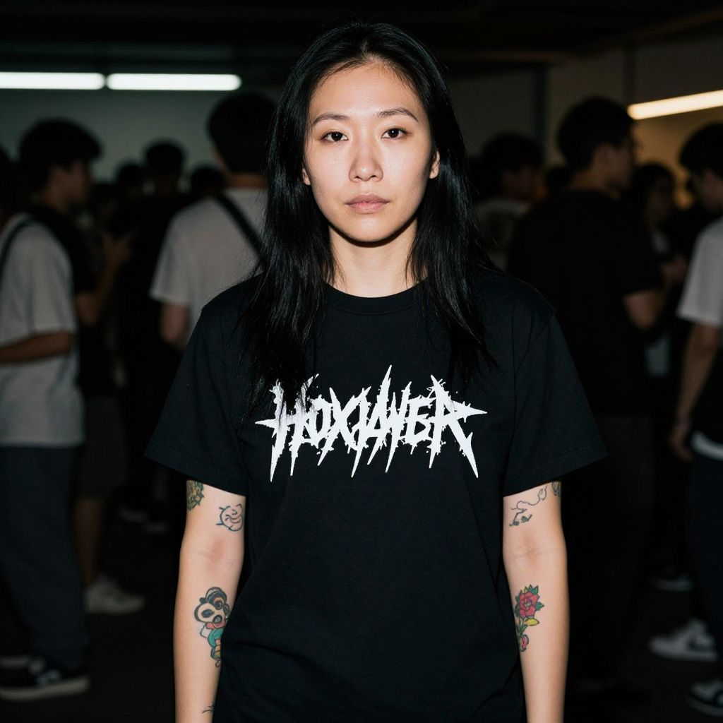 Photograph of an Asian woman with long black hair standing in a dimly lit, crowded indoor space. She's wearing a black T-shirt with a white graphic design and has colorful tattoos on both arms. Her expression is neutral, and the background is blurry with indistinct people and bright lights. The overall vibe is edgy and urban.