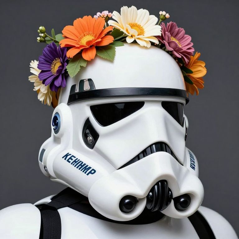 A stormtrooper helmet adorned with flowers, styled in the artistic manner of Kehinde Wiley.